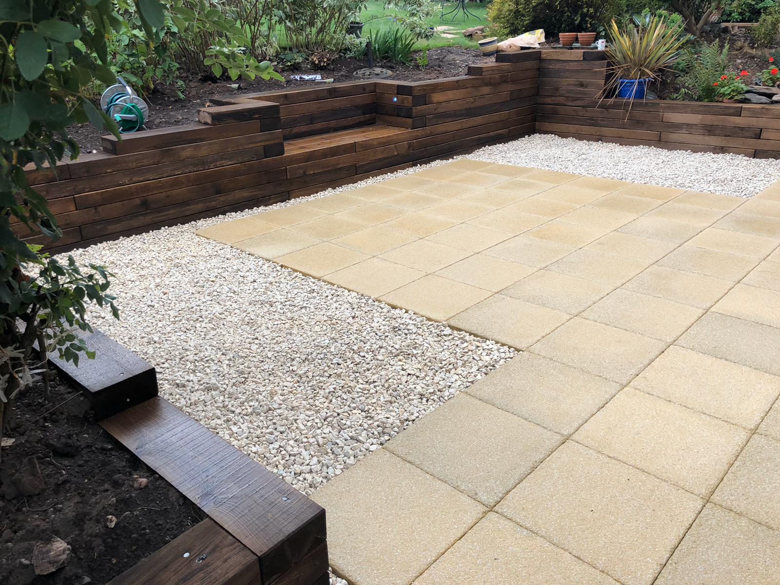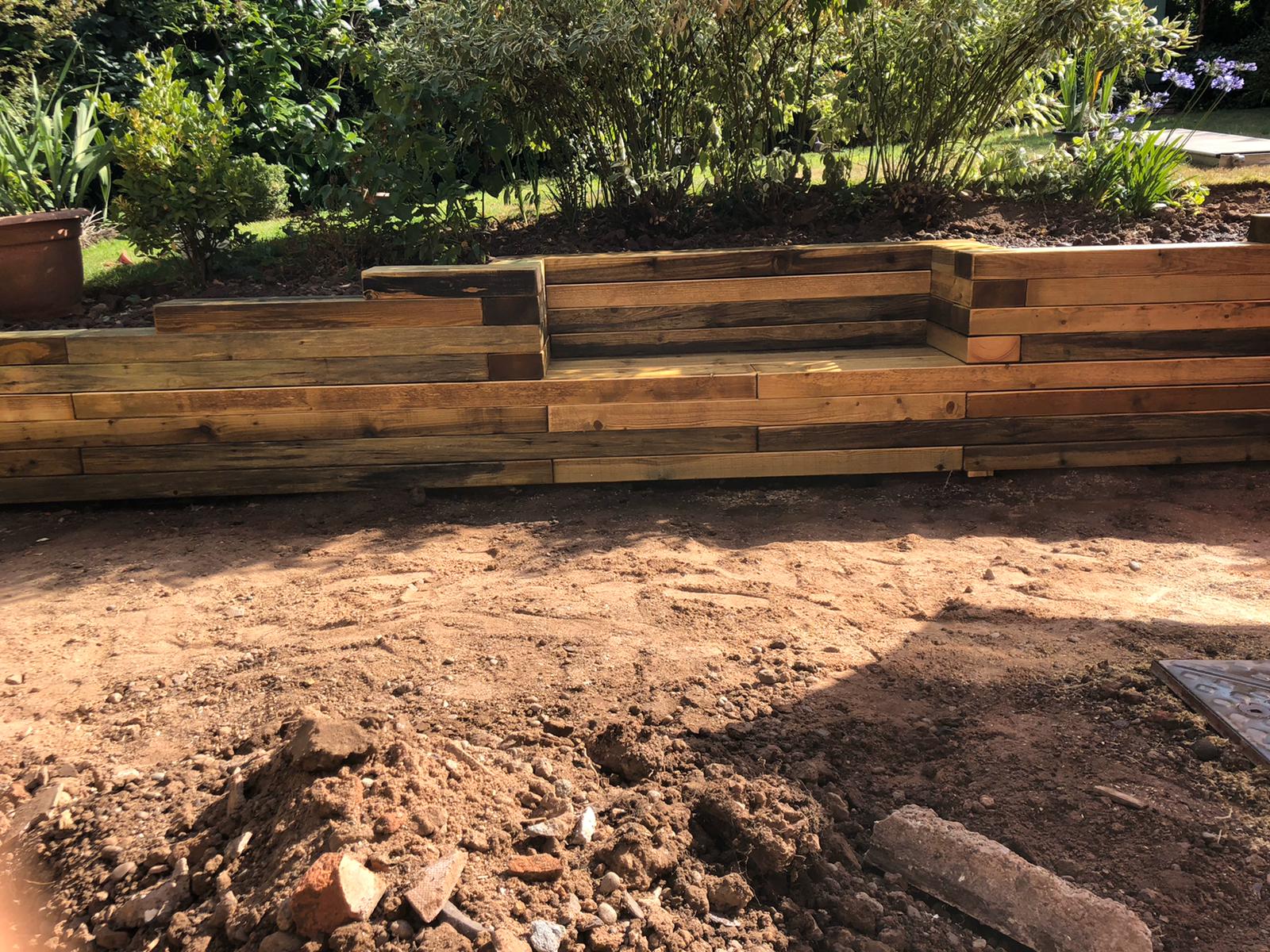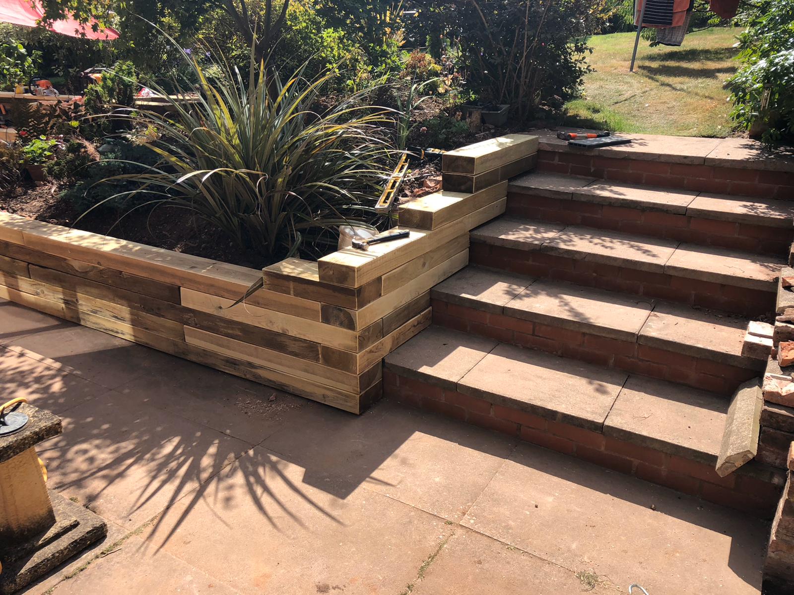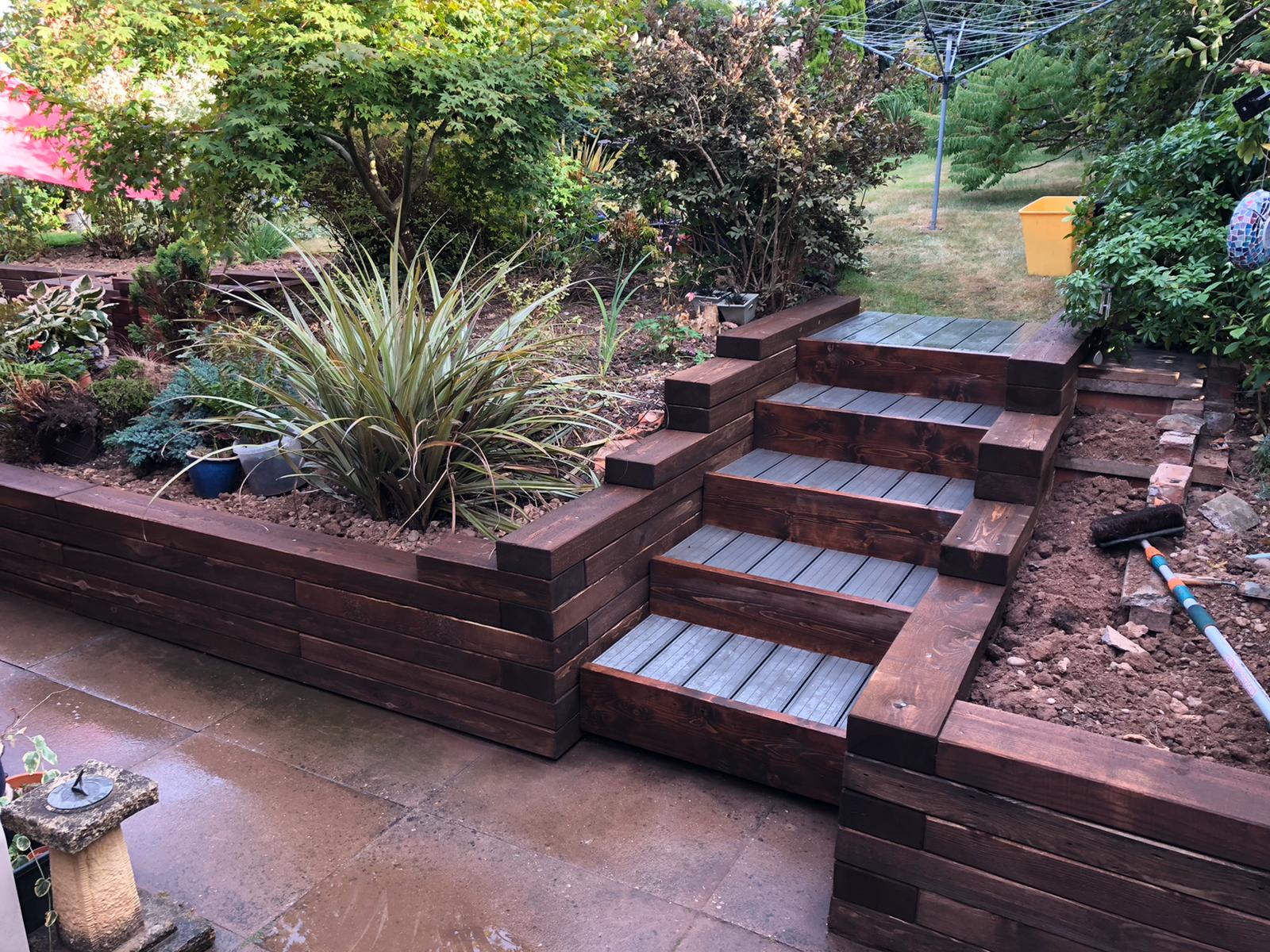 This customer needed a retaining wall, patio and seating area and some tired steps to have a makeover. Here’s what we did using composite decking and sleepers.